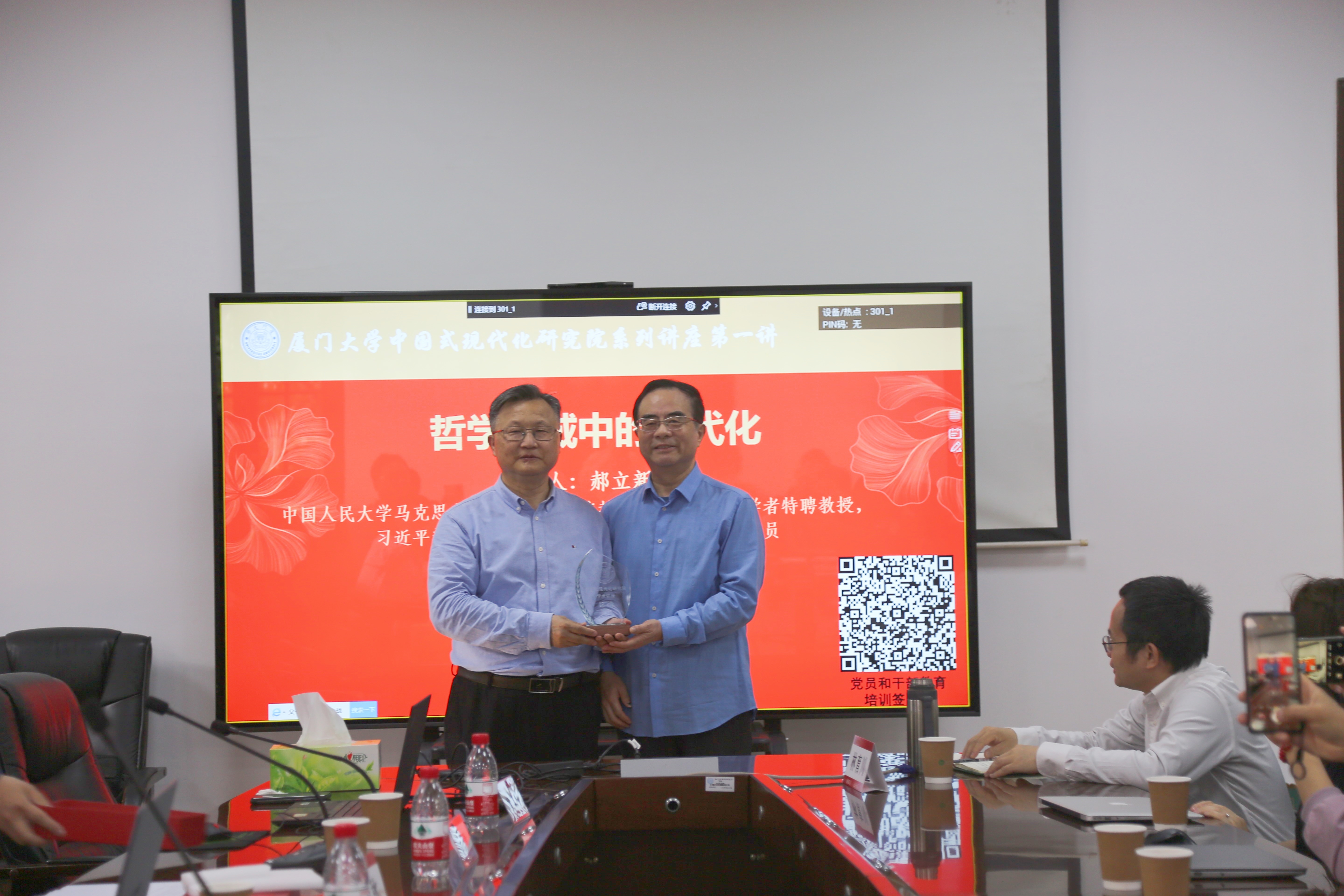 本场讲座由厦门大学中国式现代化研究院主办,厦门大学哲学系承办,中国人民大学马克思主义学院、哲学院教授,教育部长江学者特聘教授,习近平新时代中国特色社会主义思想研究院研究员郝立新主讲,厦门大学社科处副处长唐瑭教授主持。厦门大学哲学系特聘教授、厦门大学校务委员会委员、厦门大学学术委员会委员徐梦秋教授为郝立新教授颁发“厦门大学中国式现代化研究院”讲座纪念。