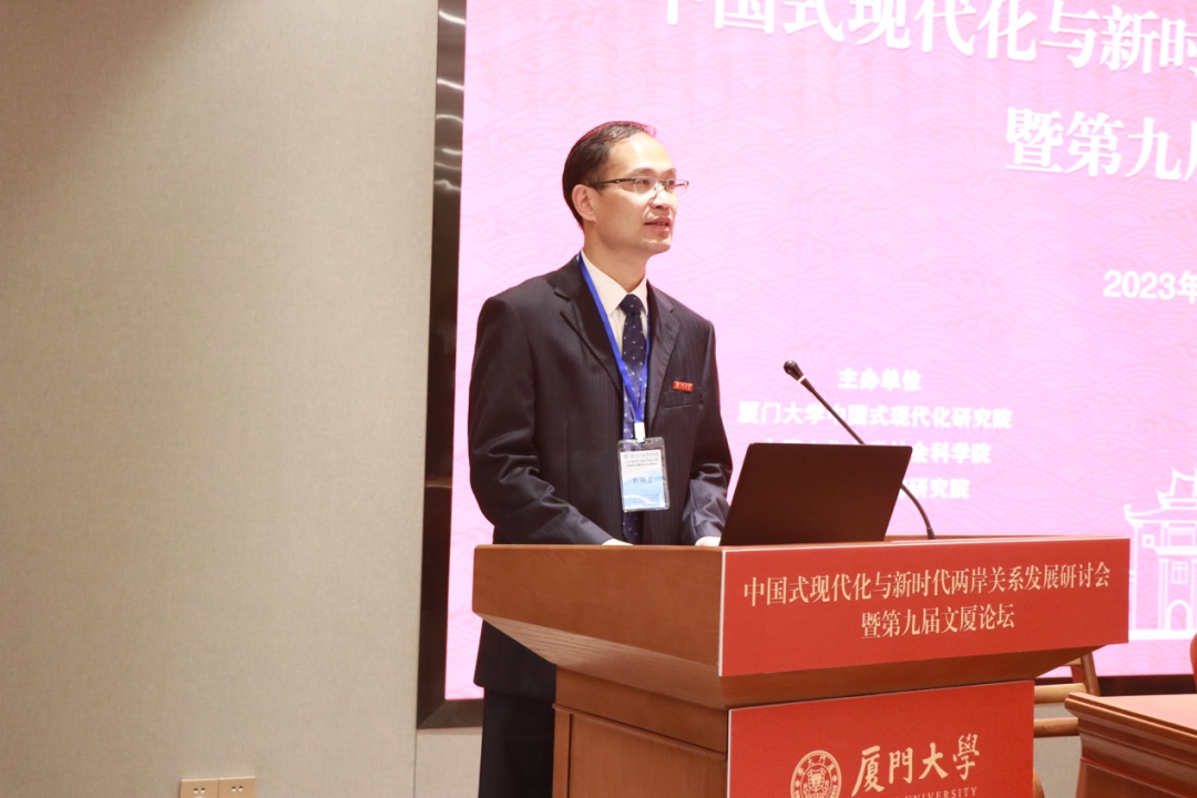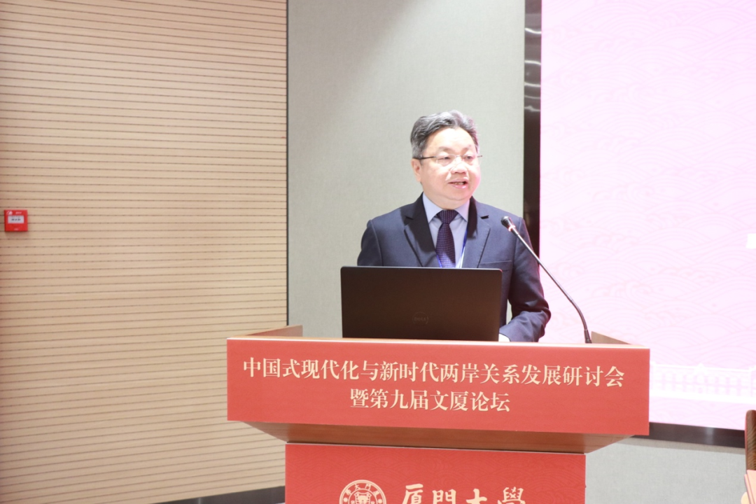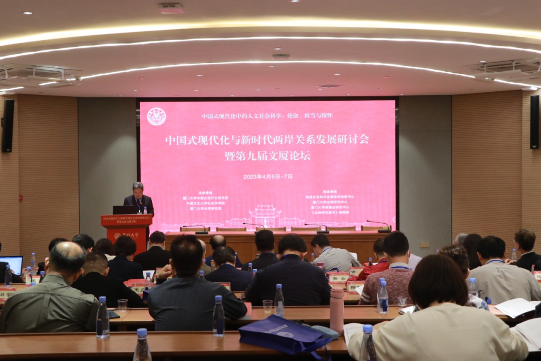 为讨论中国式现代化对两岸关系和平发展的意义、新时代的两岸关系展望,4月6日,2023年中国式现代化与新时代两岸关系发展研讨会暨第九届文厦论坛在厦门大学顺利召开。论坛由厦门大学中国式现代化研究院、中国文化大学社会科学院、厦门大学台湾研究院联合主办,由两岸关系和平发展协同创新中心、厦门大学台湾研究中心、厦门大学港澳台研究中心及《台湾研究集刊》编辑部共同协办。本届文厦论坛正式恢复线下举办,邀请到来自中国文化大学、两岸发展研究基金会、中国社科院、南京大学等两岸多所高校、研究机构共计九十余位师生参加。论坛分为开幕式、大会发言、分论坛讨论及闭幕式四个部分,来自海峡两岸的学术同仁结合自身研究领域,聚焦当前台海形势及两岸融合发展问题,就中国式现代化、新时代两岸关系、两岸产业合作等议题展开了充分对话与深入交流。