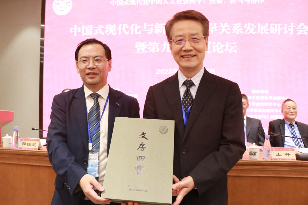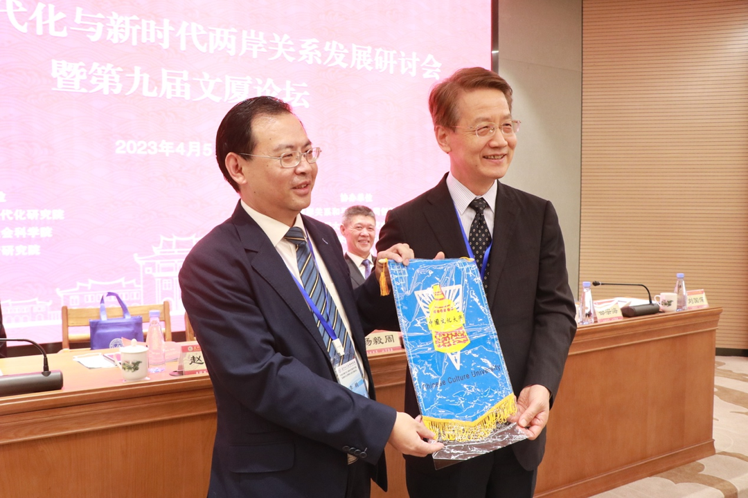 随后,论坛进行了锦旗礼品互换仪式,中国文化大学社科院院长赵建民与厦门大学台湾研究院院长李鹏交换了具有各自学校代表性的锦旗与礼品,在文厦论坛的见证下,厦门大学台湾研究院与中国文化大学社科院的友谊源远流长。