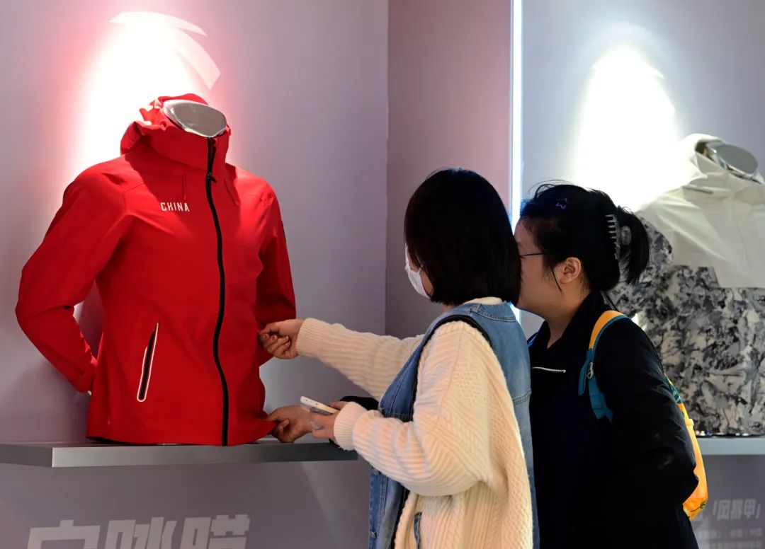 4月9日,以“接洽科技新成果,锻造新质生产力”为主题的首届晋江科技成果转化对接洽谈会在晋江国际会展中心开幕。图为两名专业参展商在安踏展位了解“安踏风暴甲”防暴雨级冲锋衣。(新华社记者 魏培全 摄)