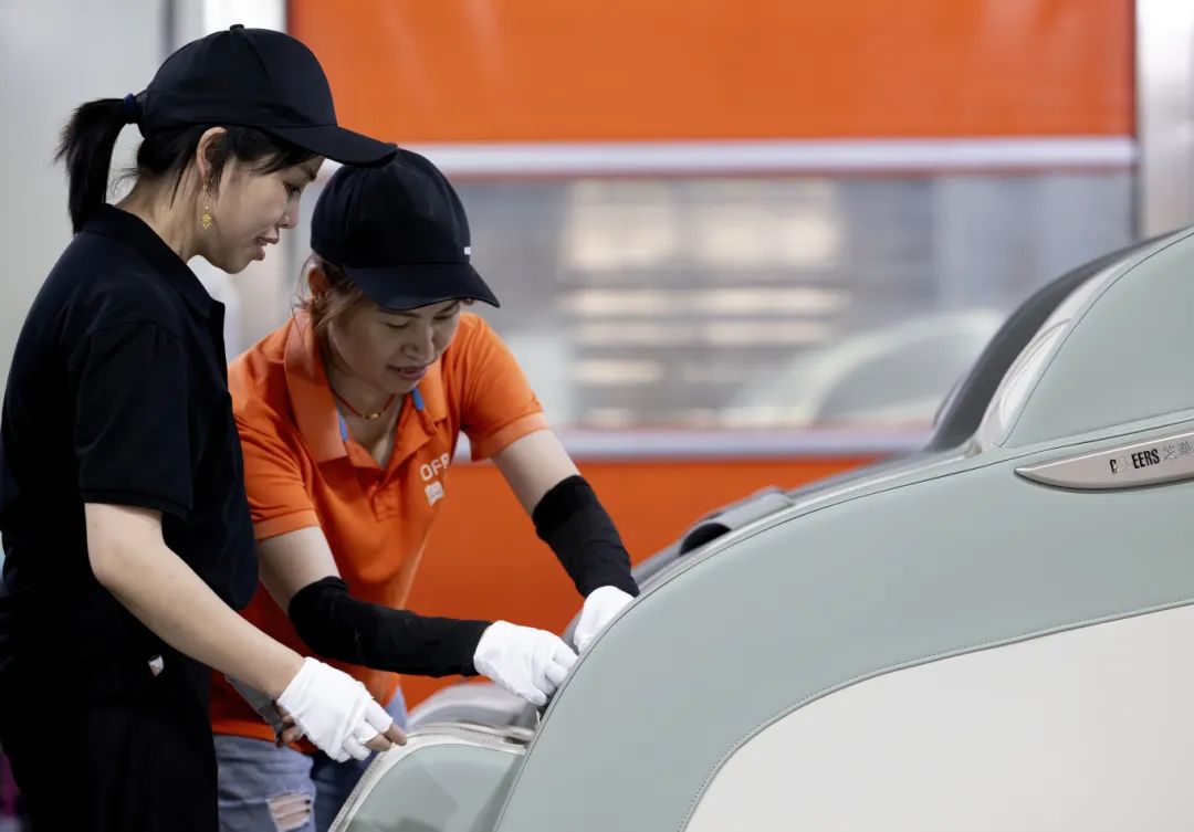 近年来,宁德市东侨经济技术开发区着力推动区内规上工业企业朝数字化、智能化、绿色化方向发展。图为4月16日,在奥弗锐(福建)电子科技有限公司按摩椅生产线上,两名工人在检验出口海外的智能按摩椅产品。(新华社记者 魏培全 摄)